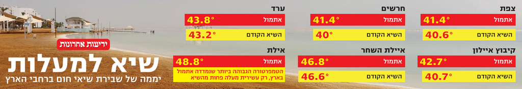 בצפת, שבה קיימות תחנות מדידה של טמפרטורות מאז 1939, נמדדה אתמול על ידי השירות המטאורולוגי טמפרטורה של 41.4 מעלות, כאשר השיא הקודם עמד על 40.6 מעלות. בקיבוץ אילון שבגליל המערבי נשבר גם כן שיא היסטורי: טמפרטורה של 42.7 מעלות, לעומת שיא קודם של 40.7 מעלות. הטמפרטורה הגבוהה ביותר בארץ נמדדה באילת: 48.8 מעלות, רק עשירית מעלה פחות מהשיא ההיסטורי בעיר הדרומית אשר עומד על 48.9 מעלות.