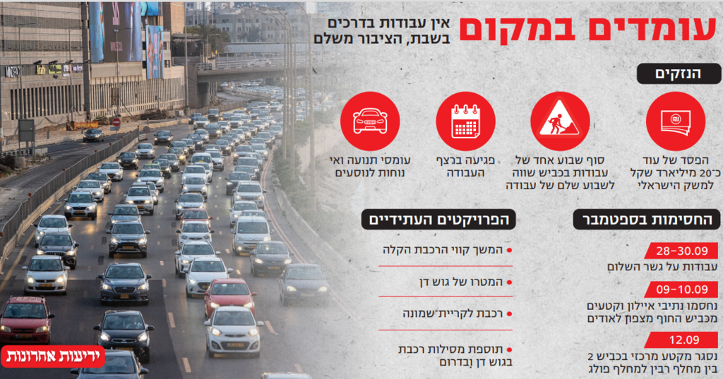 אמצע ספטמבר, יום שישי בבוקר, אתם בדרך למשפחה בכביש החוף או בנתיבי איילון והתנועה לא זזה. זו לא פעם ראשונה שסוף השבוע התחיל בתסכול בדרכים בגלל נסיעה שהייתה אמורה להיות קצרה, אבל נמשכה שעות ארוכות. פעם אחר פעם נחסמים נתיבי תנועה מרכזיים ותחנות רכבת לסירוגין בשל עבודות תשתית שמתקיימות בימי חול. זו תוצאה של מדיניות הממשלה שמונעת קיום עבודות תשתית בשבת. בשנים הקרובות ייבנו בישראל מיזמי תחבורה עצומים, בהם המטרו והרכבת הקלה ומומחים מזהירים - אם לא ייערכו עבודות בדרכים בשבת, מה שחווינו עד עתה בכבישים זה רק הקדימון.