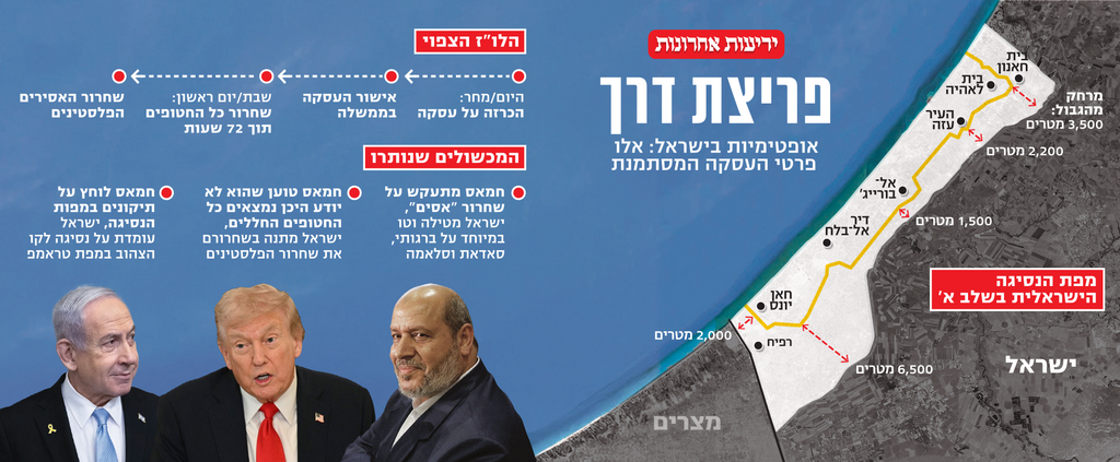 מקורות שמעורים בשיחות טוענים כי הצדדים מתקרבים להסכמה על תחילת שחרור חטופים כשכוחות צה"ל עוד בעזה, כאשר הנסיגה המלאה תתרחש אחרי שחרור כלל החטופים. משמע, שהנסיגה לא תהיה תנאי לתחילת שחרור חטופים, אך גם לא תתרחש רק בתום העסקה הגדולה, אלא רק בתום השלב הראשון. לפי הגורם המדיני הבכיר, "ישראל עומדת על כך שהנסיגה תהיה לפי 'הקו הצהוב' במפה של טראמפ. על הפרק הצעת הגמשה מצד המתווכות שלא ברור איך ממשלת נתניהו תגיב אליה, אך ישראל לא מתפשרת פה. צה"ל נשאר עמוק בתוך עזה ולא יוצא החוצה".