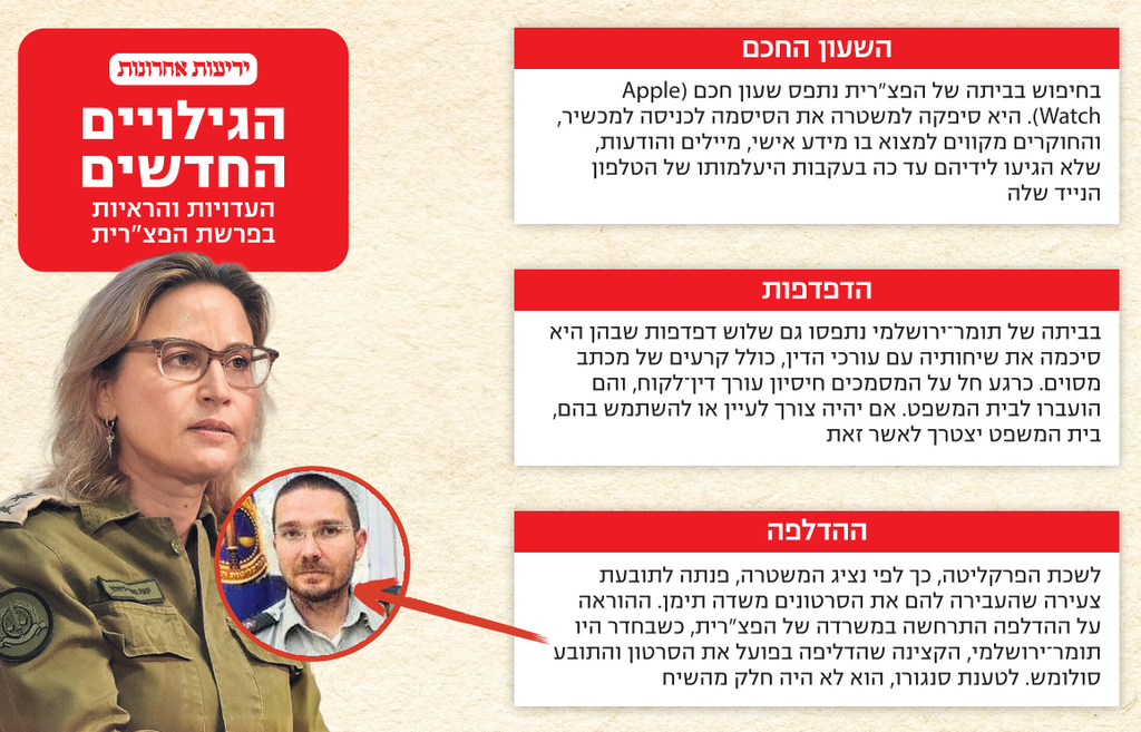 בדיון נחשף כי בחיפוש שנערך בביתה של הפצ"רית, בהתאם לצו בית משפט, נתפס שעון חכם (Apple Watch) והיא סיפקה למשטרה את הסיסמה לכניסה למכשיר. מלבדו, בבית נתפסו גם שלוש דפדפות שבהן תומר-ירושלמי סיכמה את שיחותיה עם עורכי הדין. סנגורה, דורי קלגסבלד, אמר על כך בדיון: "ביקשנו שתחזירו בגלל חיסיון ולחלופין שתכניסו למעטפה סגורה. האם החלטתם להחזיר והאם פעלתם לפי הדין והכנסתם למעטפה סגורה?" נציג המשטרה השיב: "ביום המעצר בוצע חיפוש ראשון בביתה, נתפסו שלוש דפדפות בחדר השינה כולל קרעים של מכתב ספציפי. לא הייתה מודעות שמדובר בחיסיון עו"ד-לקוח. החלטנו להכניס למעטפה סגורה, אעביר אותה לבית המשפט לעיון". השופטת קבעה: "אדגיש כי לא ניתן לעשות כל שימוש ועיון בחומר שנמצא במעטפה. אם וכאשר יעלה הצורך, תוגש בקשה מתאימה לבית המשפט".