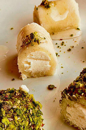 8. אפשר לגלגל בפיסטוקים, אפשר לטבול את שני הקצוות בסירופ סוכר ואז בפיסטוק קצוץ, אפשר לזלוף סירופ מעל ולקשט בקצת פיסטוק מלמעלה, ואפשר לאכול אותם ככה, נהדרים ועדינים כמו עננים מזרח-תיכוניים.