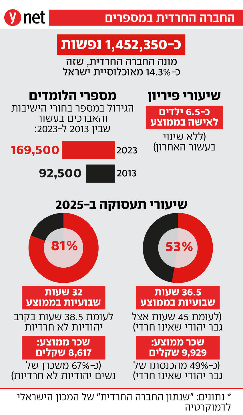 שיעור התעסוקה של גברים חרדים עומד בשנת 2025 על 53%, ושיעור התעסוקה של נשים חרדיות עומד על 81%. גבר חרדי עובד בממוצע 36.5 שעות שבועיות לעומת 45 שעות אצל גבר יהודי שאינו חרדי. אישה חרדית עובדת בממוצע 32 שעות בשבוע, לעומת 38.5 שעות בקרב יהודיות לא-חרדיות. 30% מן הגברים החרדים מועסקים בחינוך ורק 3.5% עובדים בהייטק. שיעור הנשים בתחום החינוך עומד על 42.5%.