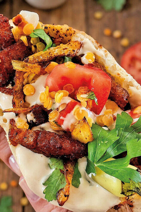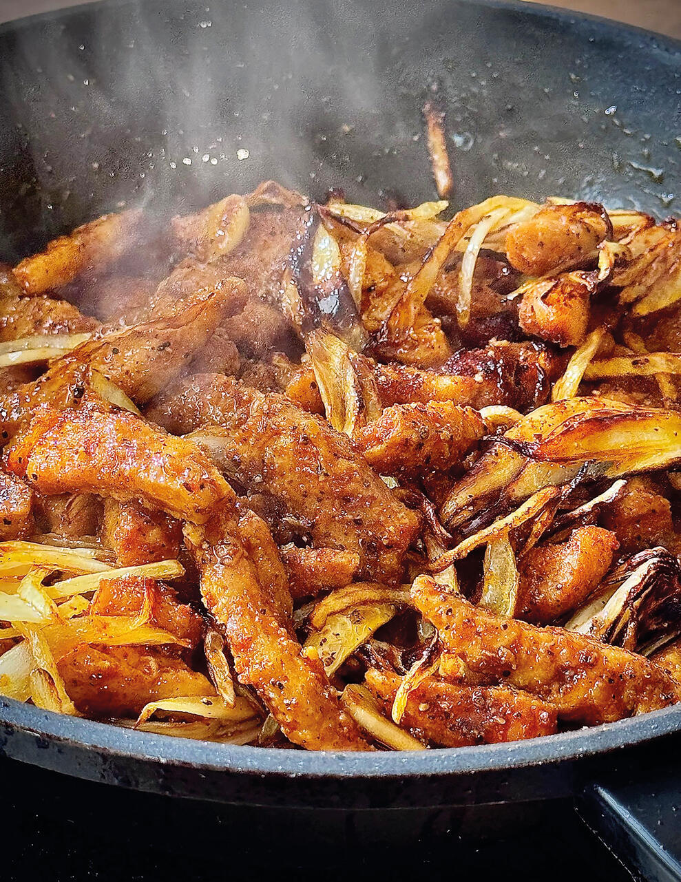 יש בה רצועות סויה יבשות (הסוד - השריה ואז סחיטה חזקה), הרבה תבלינים ואפילו נגיעה של סילאן. אנחנו רוצים שבסוף הרצועות יהיו פריכות וצרובות מבחוץ, עסיסיות מבפנים, עזות בטעם ועשירות בריח וארומה, מסביבן בצל צרוב ומעל הכל טחינה.