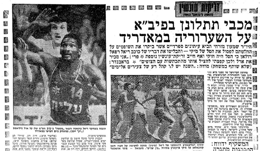 אלא שכדי להיזכר בקרב אמיתי, על הפרקט וביציעים, צריך לחזור 43 שנה אחורה, ל-17 בפברואר 1983. הצהובים הגיעו למדריד עם הגב לקיר, כשהם חייבים ניצחון כדי להישאר בתמונת העלייה לגמר - ובפביליון המלא ב-5,500 אוהדים התפתח משחק סוער במיוחד. שתי דקות ו-13 שניות לסיום, במצב של 87:91 לספרדים, קלע מיקי ברקוביץ' סל וסחט עבירה - אלא שהשופט הצרפתי פסל את הסל ופסקו במקום זה שתי זריקות עונשין. במגרש התפתחה מהומה. אנשי מכבי ת"א ניסו לשכנע את השופטים לשנות את ההחלטה והקהל הספרדי הגיב בשריקות בוז צורמות. אבל הם לא הסתפקו בזה, ולעברו של ארל וויליאמס נזרק מטבע. הסנטר של מכבי לא נשאר חייב, הוא הרים את המטבע מהפרקט והשליך אותו בחזרה לקהל. הצופים בתגובה זרקו עליו צרור מטבעות, וארל פרץ בדהרה לעבר היציעים כדי לסגור חשבון, דילג בקלות מעל המשוכה הראשונה והסתער לעבר האוהד שהתגרה בו. אלא שלפני שהדברים יגיעו לקרב אגרופים, קפץ אחריו ליציע אולסי פרי, שתפס את וויליאמס וממש השליך אותו בחזרה לפרקט.