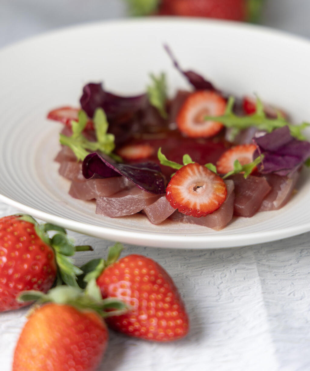 3. מסדרים את פרוסות הטונה בצלחת, שופכים מעל את הרוטב ובין הפרוסות מסדרים את התותים הפרוסים ועלי הבזיליקום.