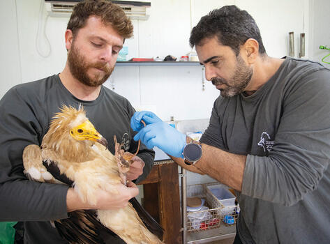 יחד עם אורתופדים מומחים חיצוניים ואנשי תכנון פרותזות, הושתל בתחילה תותב לתוך העצם ואז הותאמה פרותזה חדשנית. ד"ר אוהד הצופה, אקולוג העופות ברשות, מסביר כי הרחם פעיל ומתפקד טוב ועל גבו הותקן משדר GPS לטובת מעקב וניטור.