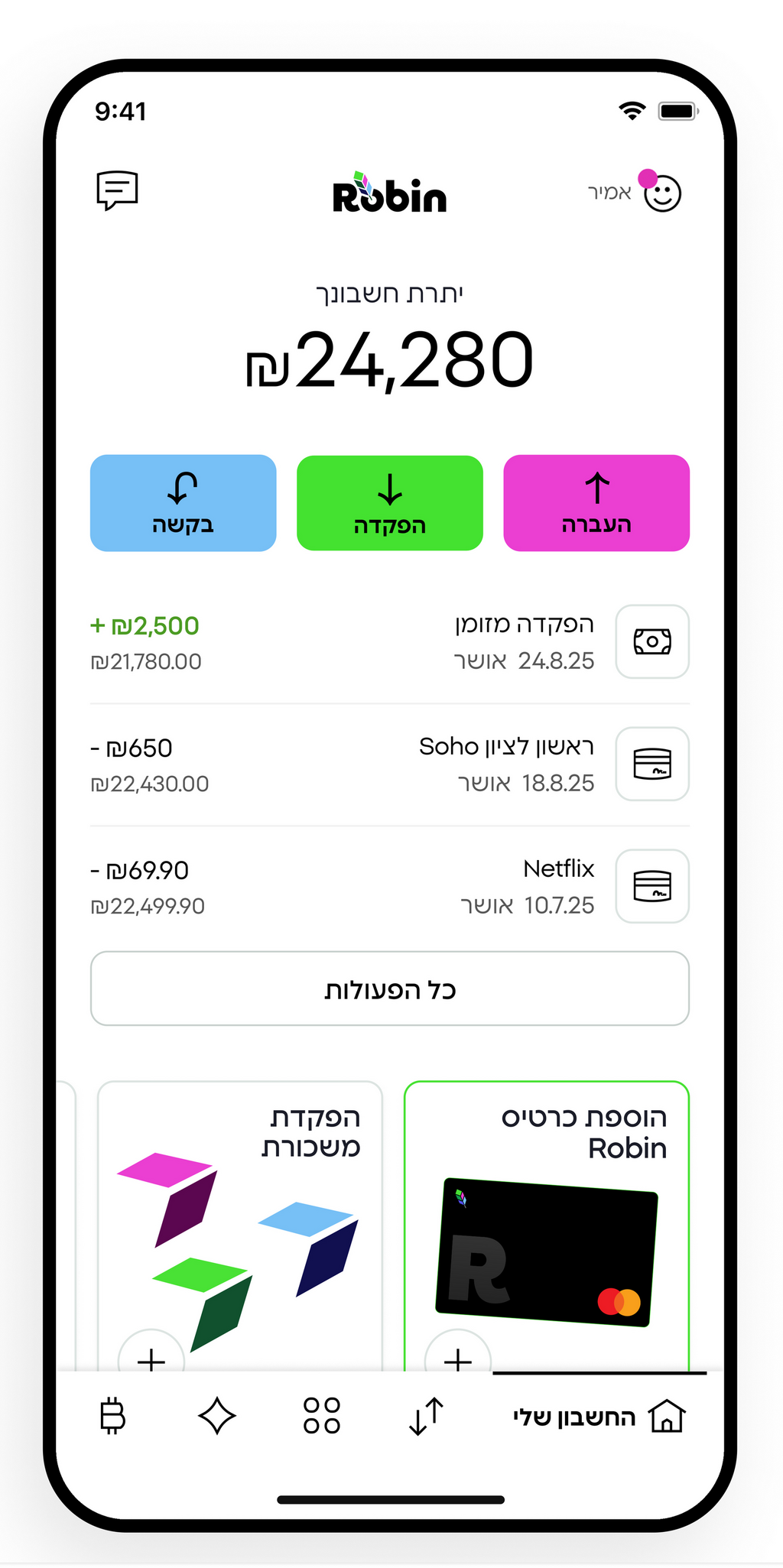 Robin הוא שירות הפועל תחת רישיון ופיקוח של רשות שוק ההון, ומציע התנהלות כלכלית באמצעות אפליקציה דיגיטלית ללא צורך בחשבון בנק. קהל היעד: מי שלא מחזיקים חשבון בנק פעיל או מתקשים לפעול דרך המערכת הבנקאית — כמו רבים ממשקי הבית בחברה הערבית ועסקים שנסגרו או שנפתחו נגדם תיקי הוצאה לפועל.