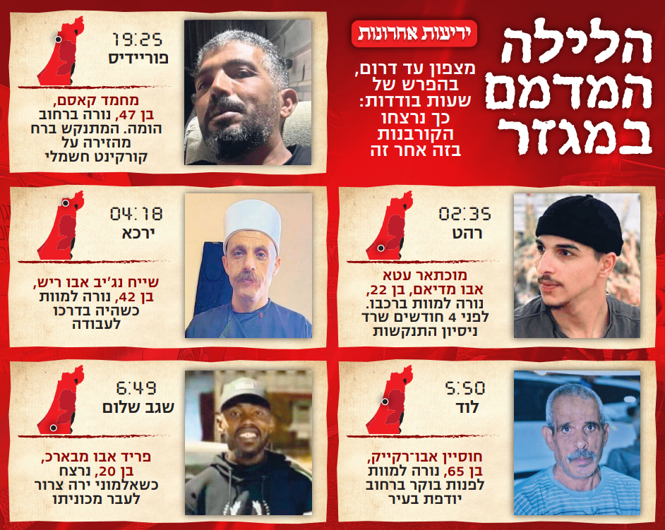 מוחמד קאסם, בן 47 מפוריידיס. מוכתאר עטא אבו מדיאם, בן 22 מרהט. שייח נג'יב אבו ריש, בן 47 מירכא, חוסיין אבו-רקייק, בן 65 מלוד. פריד אבו מבארכ, בן 20 משגב שלום. אלה הם השמות האחרונים שהתווספו לשורת הקורבנות הבלתי נגמרת של גל האלימות הגואה בחברה הערבית. חמישה נרצחים בתוך 12 שעות בלבד, לילה אחד מדמם ואכזרי.