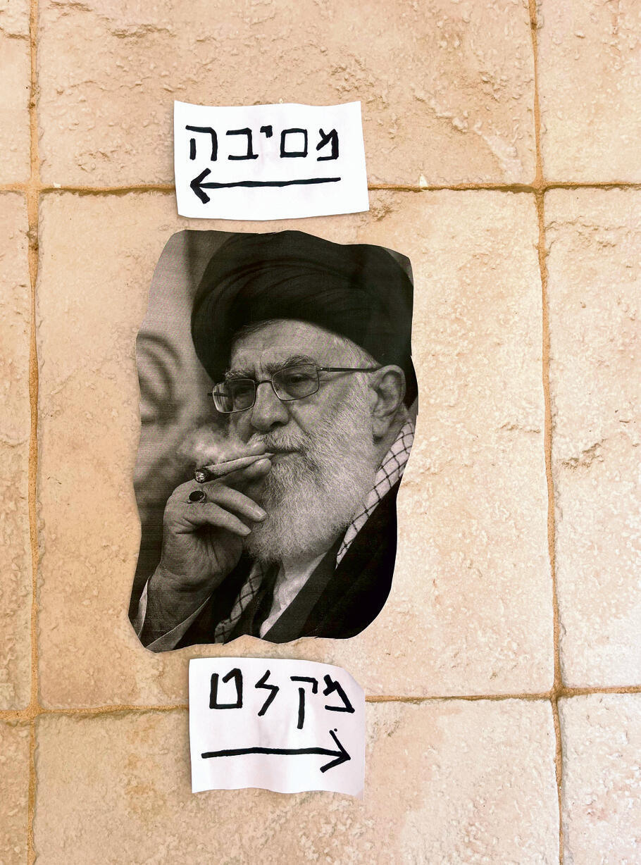 על קיר הבית התל-אביבי תלויה תמונה היפסטרית כמעט של קשיש מעשן בשחור-לבן. המנהיג העליון של איראן, עלי חמינאי. על קרעי סלוטייפ, שפעם אטמו איתו חדרים במלחמות אחרות, יש מקרא מפה. למסיבה פנה שמאלה, המקלט מימין.