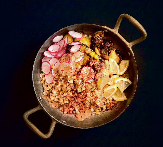 3. מניחים את החיטה החמה בקערה, מוסיפים את כרובי הניצנים הצלויים, מסדרים פרוסות של צנוניות וקוביות של לימון כבוש.