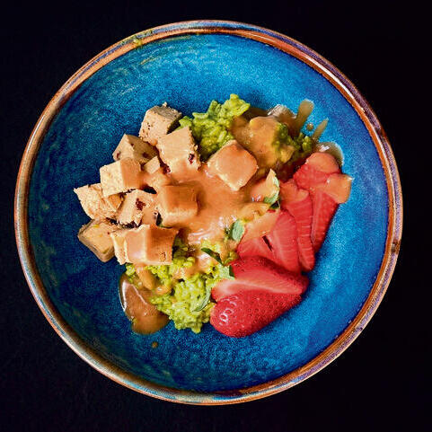 הקערה המאתגרת של החבורה אבל מספקת וממכרת. את הפירות הטריים אפשר לגוון. בסיס האורז פה הוא העניין, קרמי ועשיר ואגוזי עם הטעם הירוק המיוחד של המאצ׳ה, שהשתלטה סופית על ישראל.