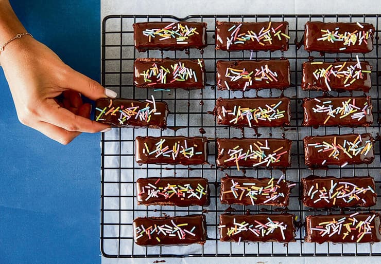 • מוציאים את הבראוניז לקרש חיתוך שעליו נייר אפייה וחותכים לאצבעות בכל גודל שאוהבים. אפשר גם לחתוך בתוך התבנית אבל זהירות לא לשרוט אותה.