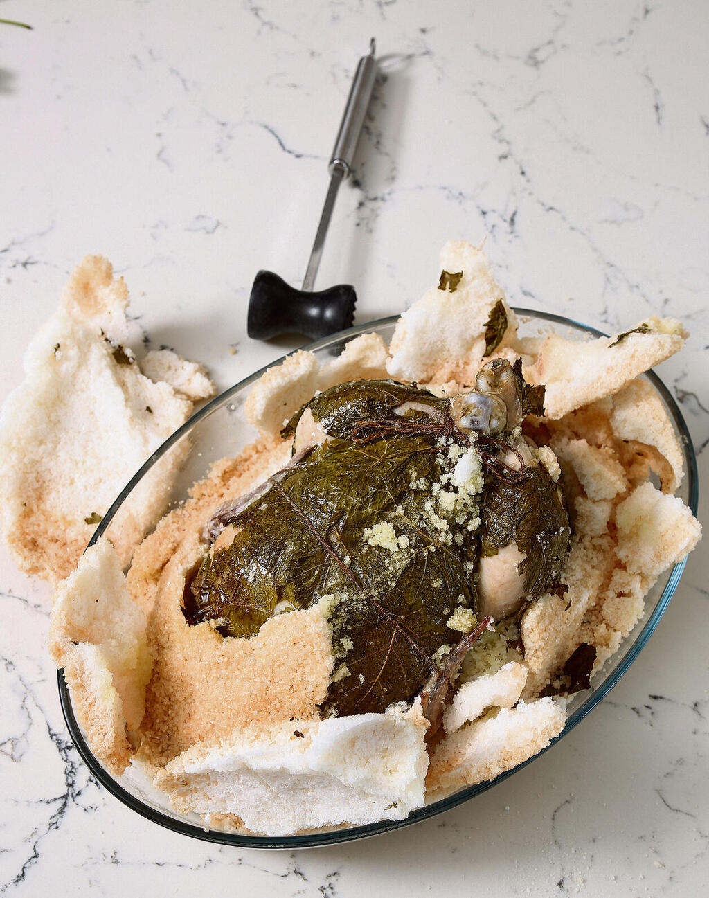5. לאחר האפייה מקלפים את המלח מהעוף. מגישים ללא המלח.