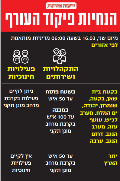 הבקעה, הערבה, יו"ש, עמק בית שאן, מערב לכיש ועוטף עזה ‑ באזורים אלה אימץ פיקוד העורף את מתווה שר החינוך, ואישר חזרה ללימודים פיזית בבתי הספר ממוגנים, החל מיום שני. הרשויות שבהן ניתן יהיה לקיים לימודים יוגדרו “צהובות”.
