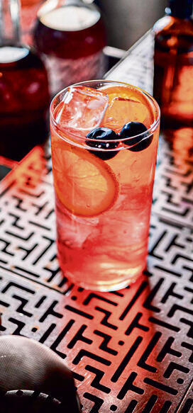 3. מערבבים את כל המרכיבים בכוס הייבול עם קרח, לערבב ולקשט עם פלחי תפוז ואוכמניות.