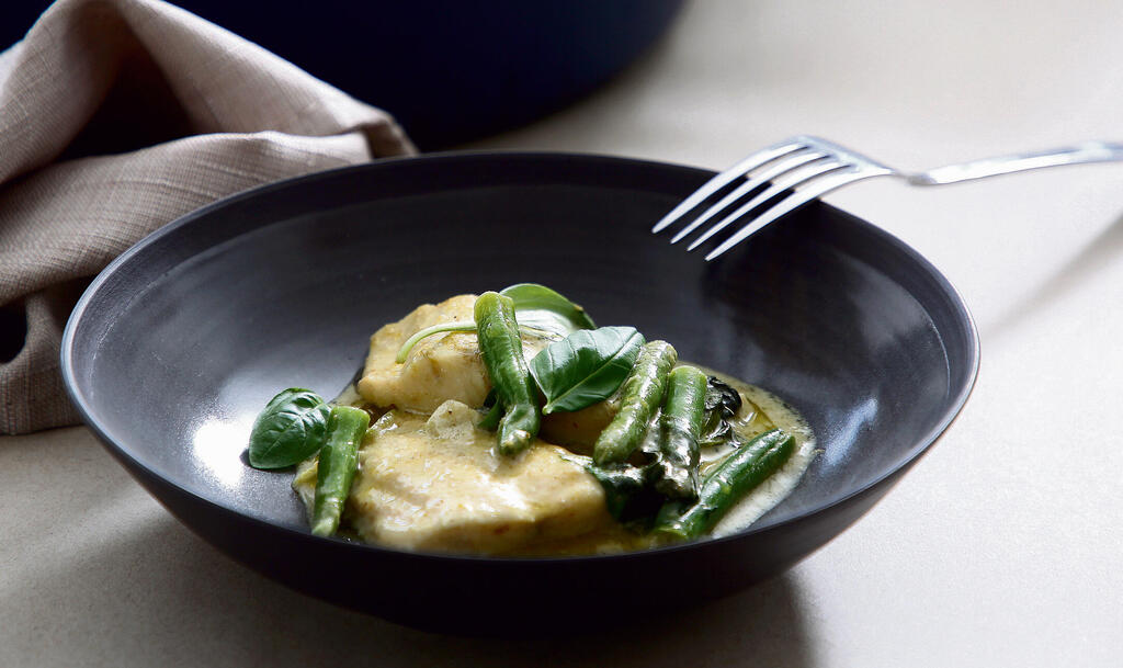 דג ברוטב קארי ירוק, בזיליקום ושעועית