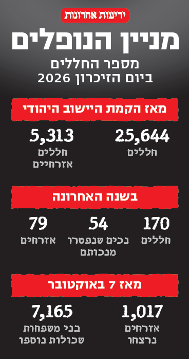 שוב שתי צפירות, שוב כאב עמוק בלב - ושוב מניין הנופלים והנרצחים שרק ממשיך לעלות. לקראת יום הזיכרון שיצוין ביום שלישי בשבוע הבא, משרד הביטחון והביטוח הלאומי פרסמו אתמול את נתוני החללים ונפגעי פעולות האיבה.