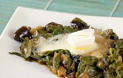 שקשוקה בלי עגבניות? יש חיה כזאת. יעל גרטי הכינה שקשוקה תרד עם נענע, זיתים, פלפל צ'יפוטלה, גבינת פטה והפתעה: רוטב סויה, שמשתלב נהדר