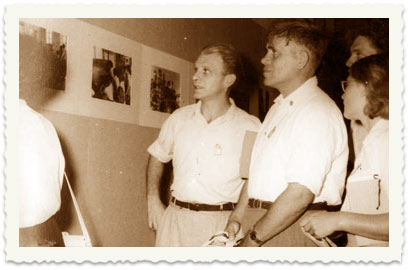 1. כפי שסיפרנו בכתבה קודמת, לצד פעילותו הציבורית הרבה, רפי התמיד בתחביב הצילום. בשנות השישים אף הקים מסגרת ארגונית לצלמי קיבוצי השומר הצעיר. בתצלום: רפי מארח את החבר יעקב חזן בתערוכת הצילום הראשונה.
