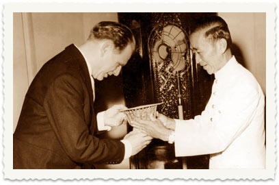 12. הנסיך נורודום סיהנוק מגיש מתנה לשר החוץ אבא אבן בביקורו בקמבודיה במרץ 1967, רפי מאחור.