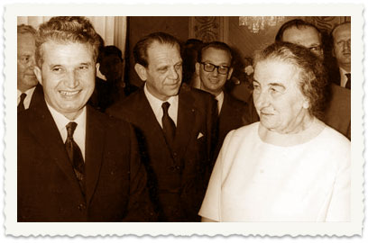 17. גולדה מאיר בפגישה עם נשיא רומניה ניקולאה צ'אושסקו בעת הביקור. רפי מאחור.