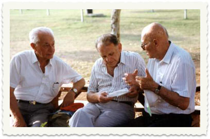 18. לאחר סיום השליחות כשגריר בעולם, חזר רפי הביתה - הישר לפעילות הכלכלית בקיבוצו. בתמונה, מימין: משה אלפן, רפי בנשלום, אפרא אגמון (טייכמן) - שלושת החברים בלב ובנפש שעברו כה הרבה בחייהם והצליחו לגבור על הנאצים באירופה ולהביא תקומה לישראל.