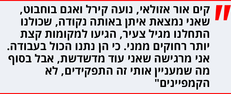 "ההורים שלי דאגו מגיל צעיר שאני אלך לבית ספר כמו כולם ושיהיו לי חיים רגילים ומהמקום הזה, קים אור אזולאי, נועה קירל ואגם בוחבוט, שאני נמצאת איתן באותה נקודה, שכולנו התחלנו מגיל צעיר והתפרסמנו מאוד מוקדם, הגיעו כביכול למקומות קצת יותר רחוקים ממני. כי הן נתנו הכול בעבודה. נועה כמובן, קים פתחה מותג ופרזנטורית של 3,000 דברים, ואגם שהיא שנים בתעשייה. אני מרגישה שאני עוד מדשדשת, כאן קוטפת משהו קטן, כאן עוד משהו קטן, לאט־לאט מטפסת בסולם. אבל בסוף מה שמעניין אותי זה התפקידים, לא הקמפיינים".