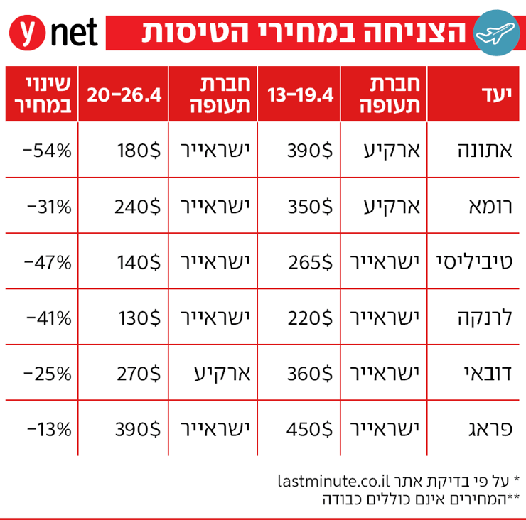 כך למשל, טיסה לדובאי בין התאריכים 28.4–13.5 עם ארקיע מוצעת במחיר של 278 דולר לאדם (ללא כבודה), בעוד שבפסח המחיר הממוצע עמד על 619 דולר לאדם. טיסה לאתונה עם ישראייר בין התאריכים 6–13.5 מוצעת כעת ב-105 דולר בלבד (ללא כבודה), לעומת מחיר ממוצע של 279 דולר בפסח. גם טיסה למדריד לאחר החג, בין התאריכים 28.4–7.5 עם ITA, מוצעת ב-287 דולר כולל מזוודה – לעומת 704 דולר בממוצע במהלך החג. טיסה לכרתים עם בלו בירד, בין התאריכים 24.4–1.5, מוצעת ב-160 דולר לאדם (ללא כבודה), לעומת מחיר של 403 דולר בממוצע בפסח.