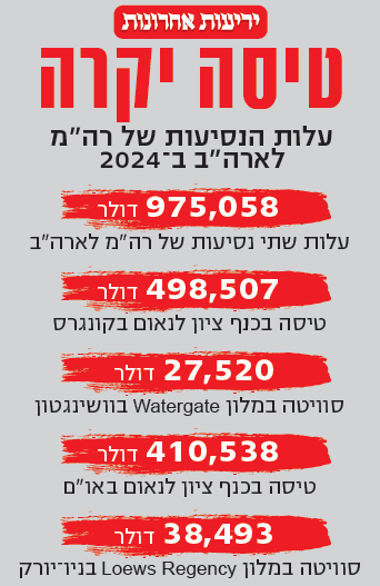 שתי נסיעותיו של ראש הממשלה בנימין נתניהו לארה"ב בשנת 2024 – הראשונה לנאום בקונגרס והשנייה לנאום באומות המאוחדות, בנוסף לעלות הטיסה ב"כנף ציון" והאירוח בבתי המלון, עלו למשלם המסים הישראלי כמעט מיליון דולרים (975,058 דולרים), לא כולל הוצאות אבטחה. כך עולה מתשובת משרד רה"מ לעמותת "בהצלחה" בעניין שתי הנסיעות.